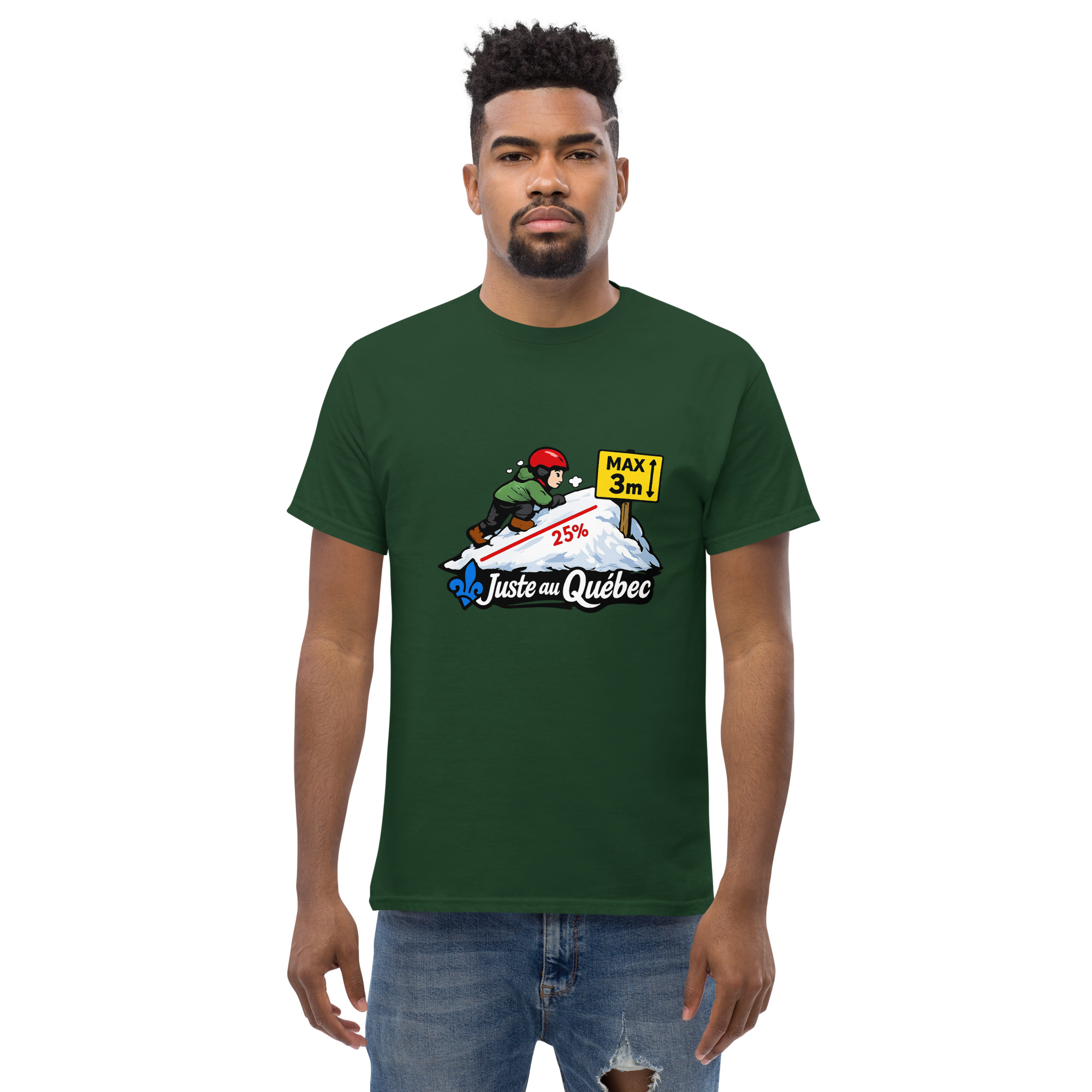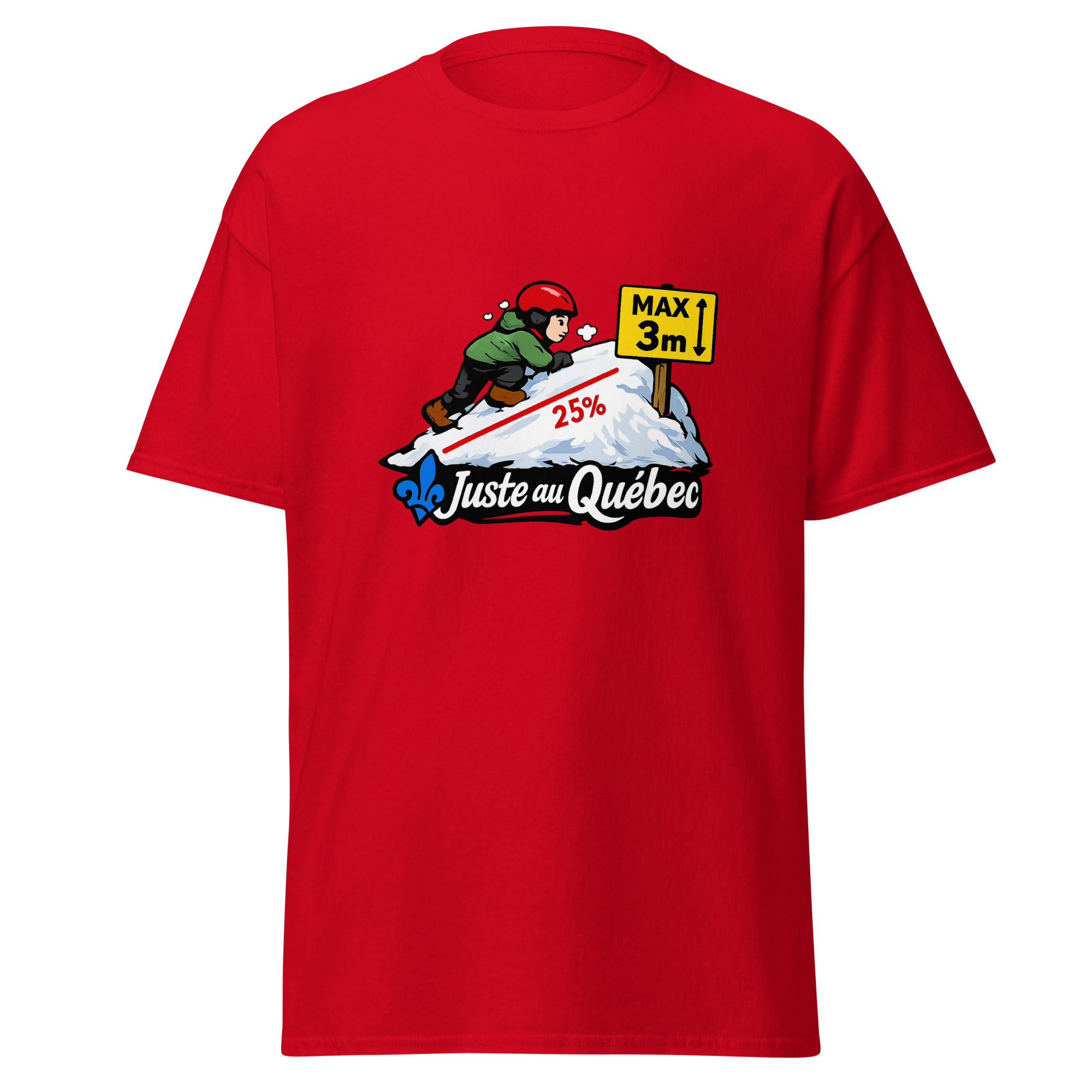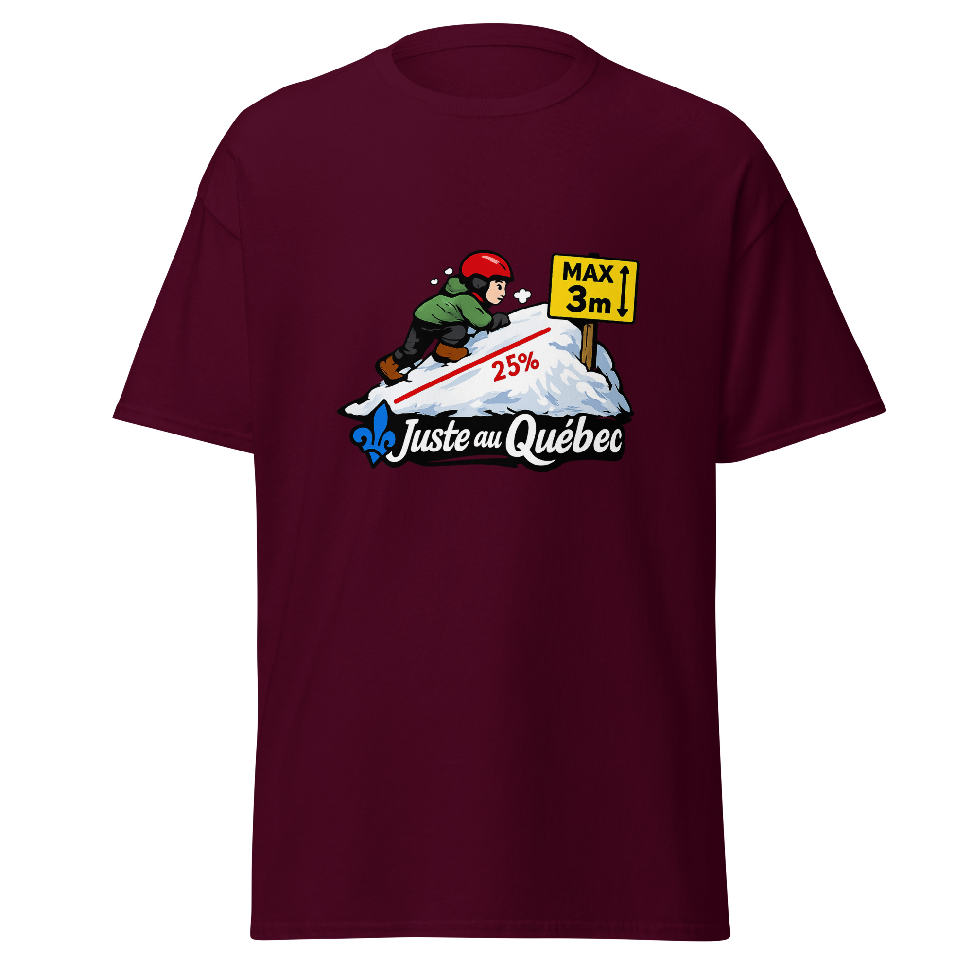 Ce t-shirt Butte de neige – Juste au Québec mise sur un humour absurde et bien ancré dans l’actualité. D’abord, l’illustration montre un enfant casqué qui tente de grimper une butte de neige réglementée. Ensuite, les indications 25 % et max 3 m rappellent une règle officielle devenue franchement comique. Ainsi, le visuel transforme une mesure sérieuse en gag visuel immédiat.