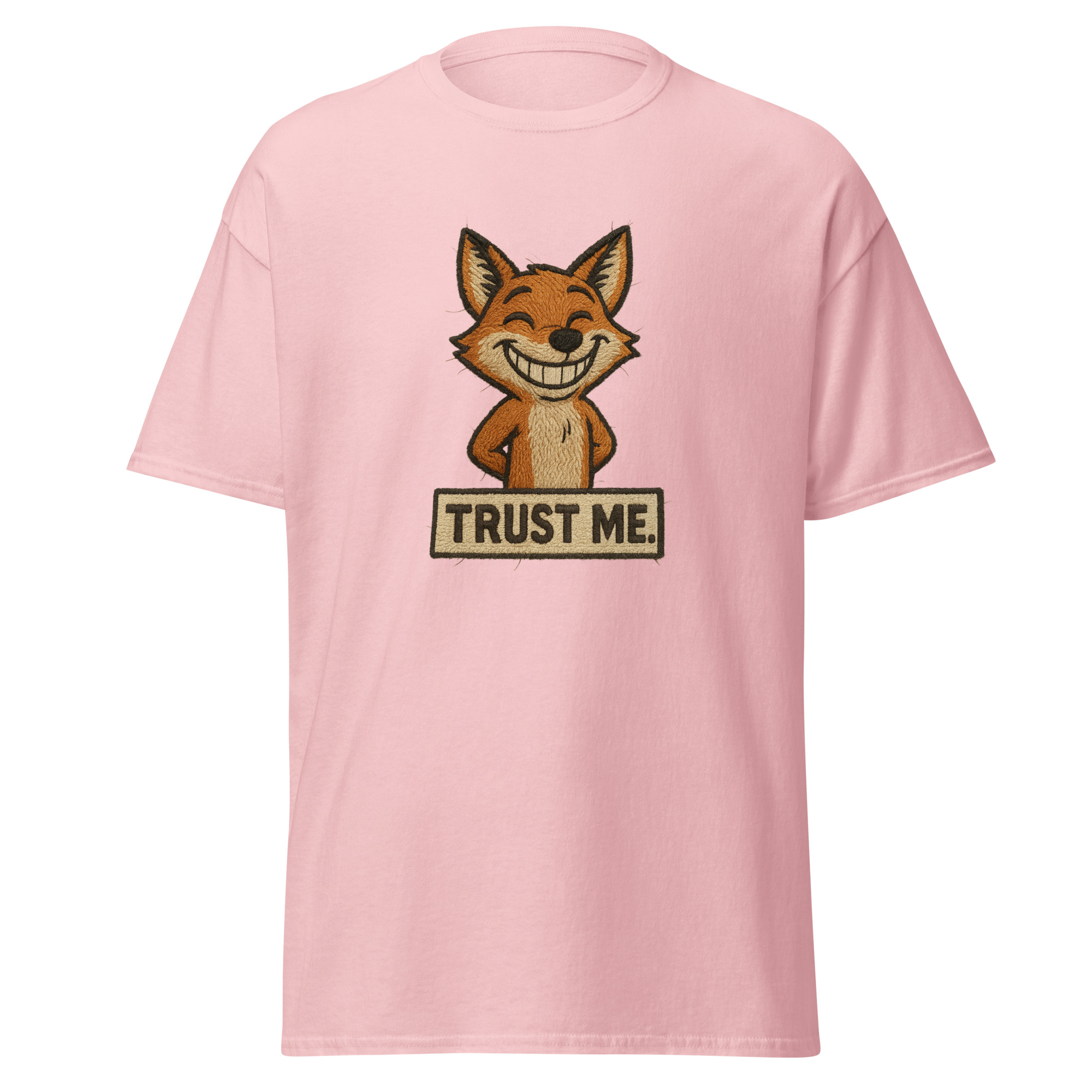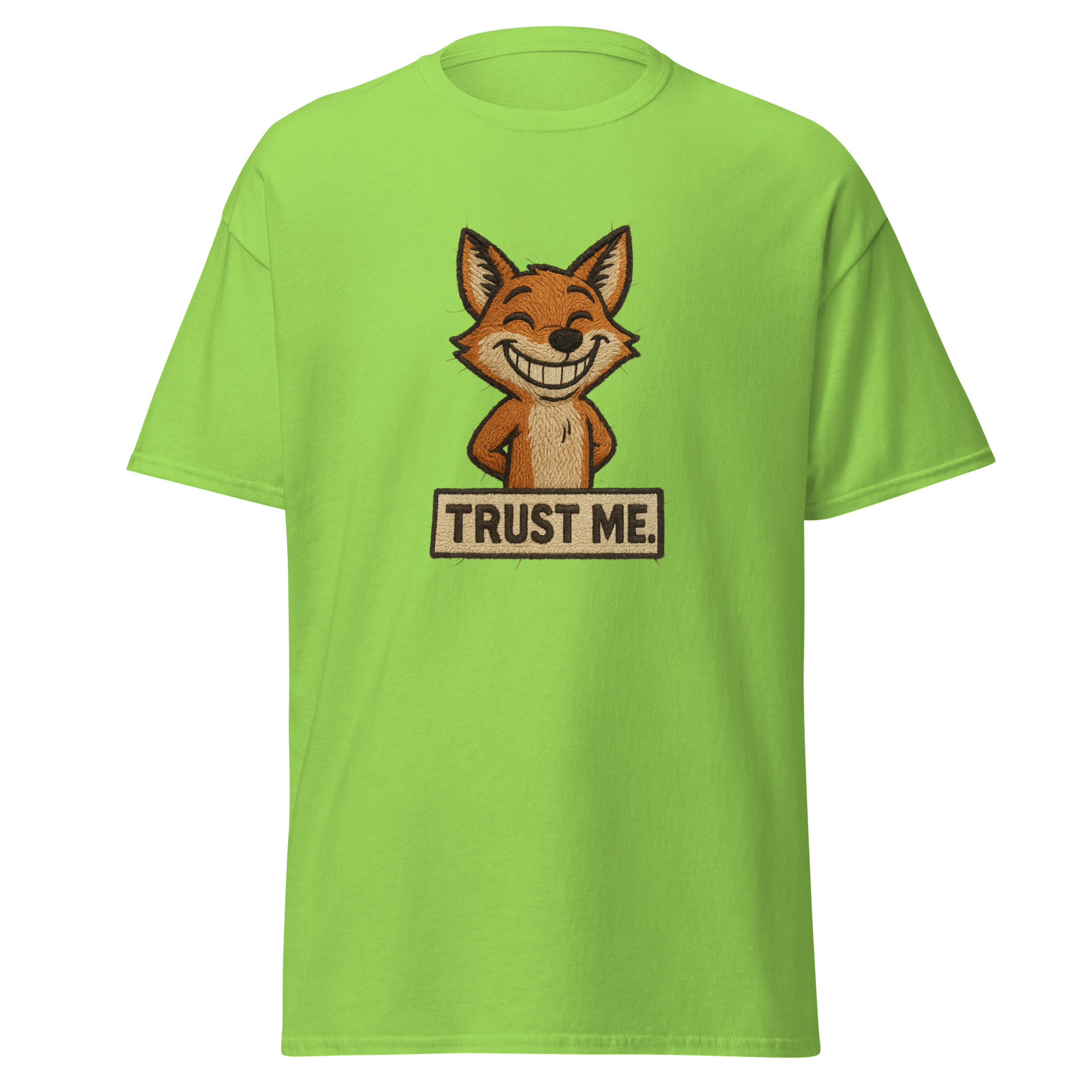 Ce t-shirt Fox Trust Me mise sur un humour visuel subtil et malicieusement assumé. D’abord, l’illustration présente un renard au large sourire, illustré dans un style écusson brodé très soigné. Ensuite, le message « Trust me. » contraste avec l’air beaucoup trop confiant du personnage. Ainsi, le design joue immédiatement sur le doute et l’ironie.