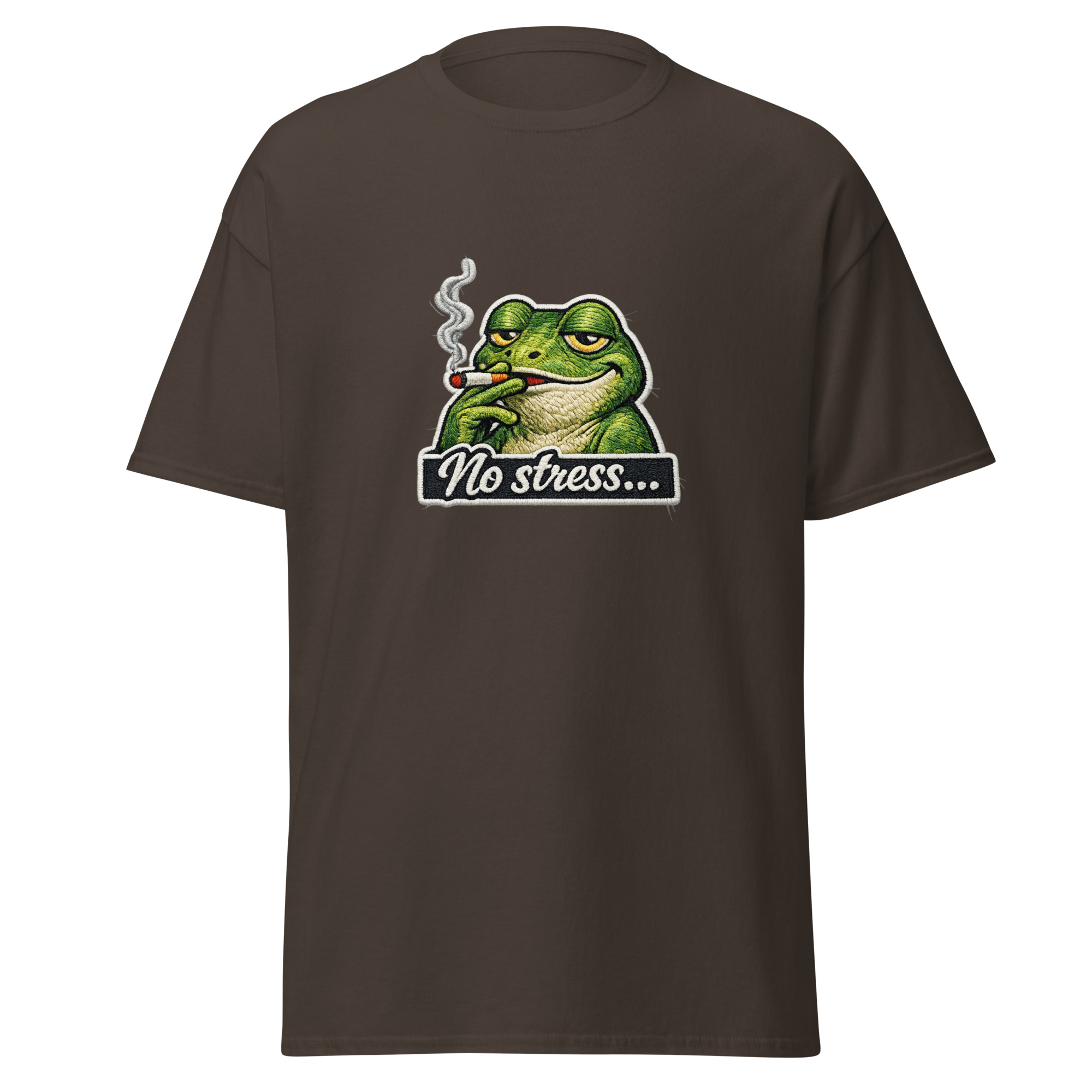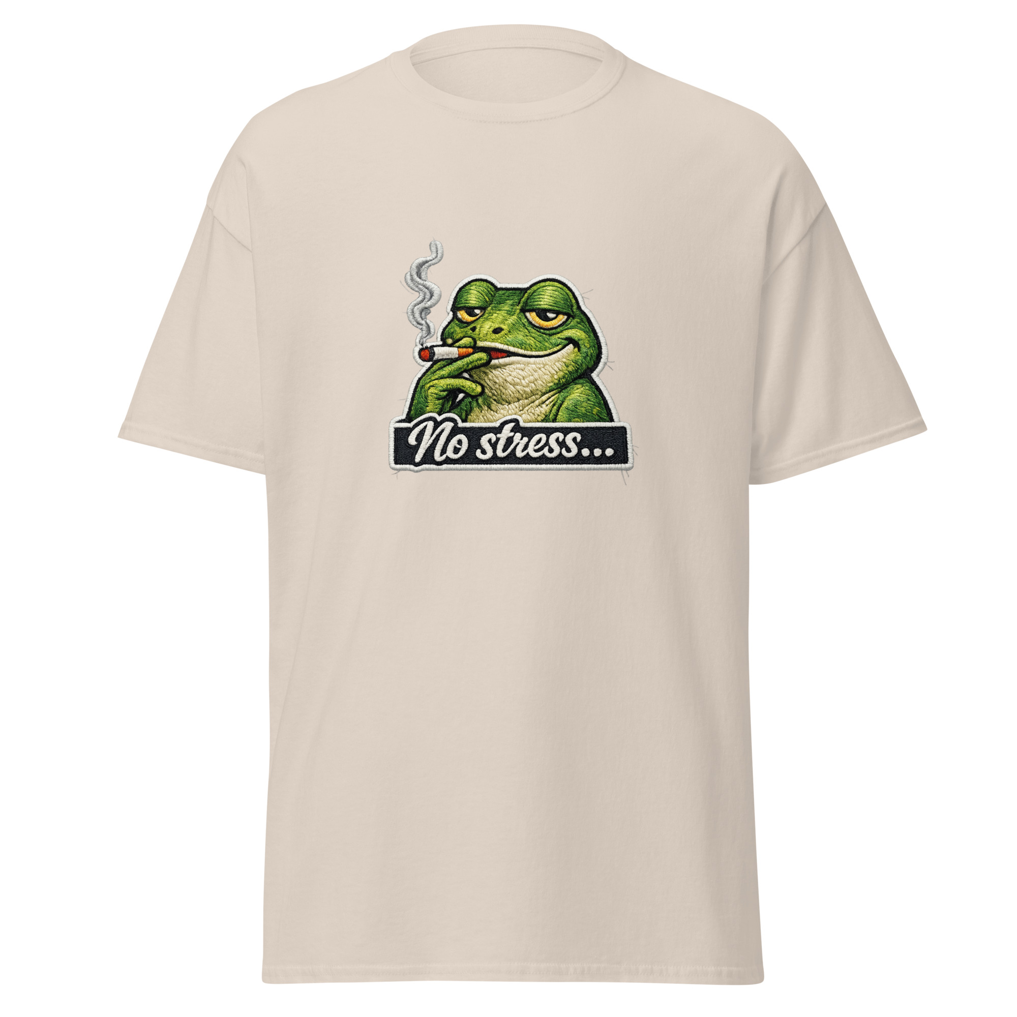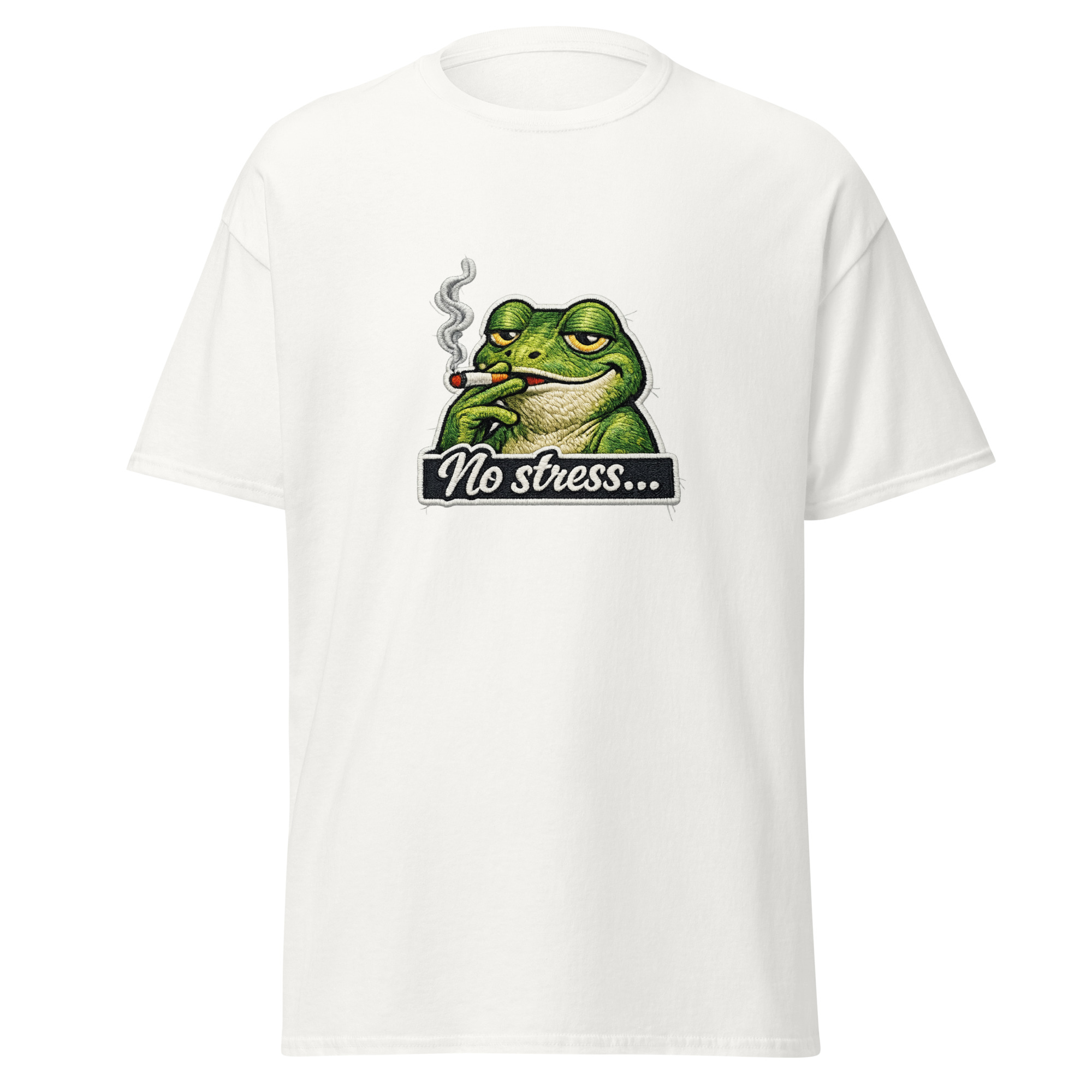 Ce t-shirt no stress met en scène une grenouille détendue, cigarette à la bouche, avec une expression parlante. Le contraste entre le personnage nonchalant et le message No stress crée immédiatement une ironie claire. Ainsi, le visuel joue sur l’exagération et transforme le calme en une attitude volontairement absurde. Par conséquent, le design devient à la fois drôle et mémorable.