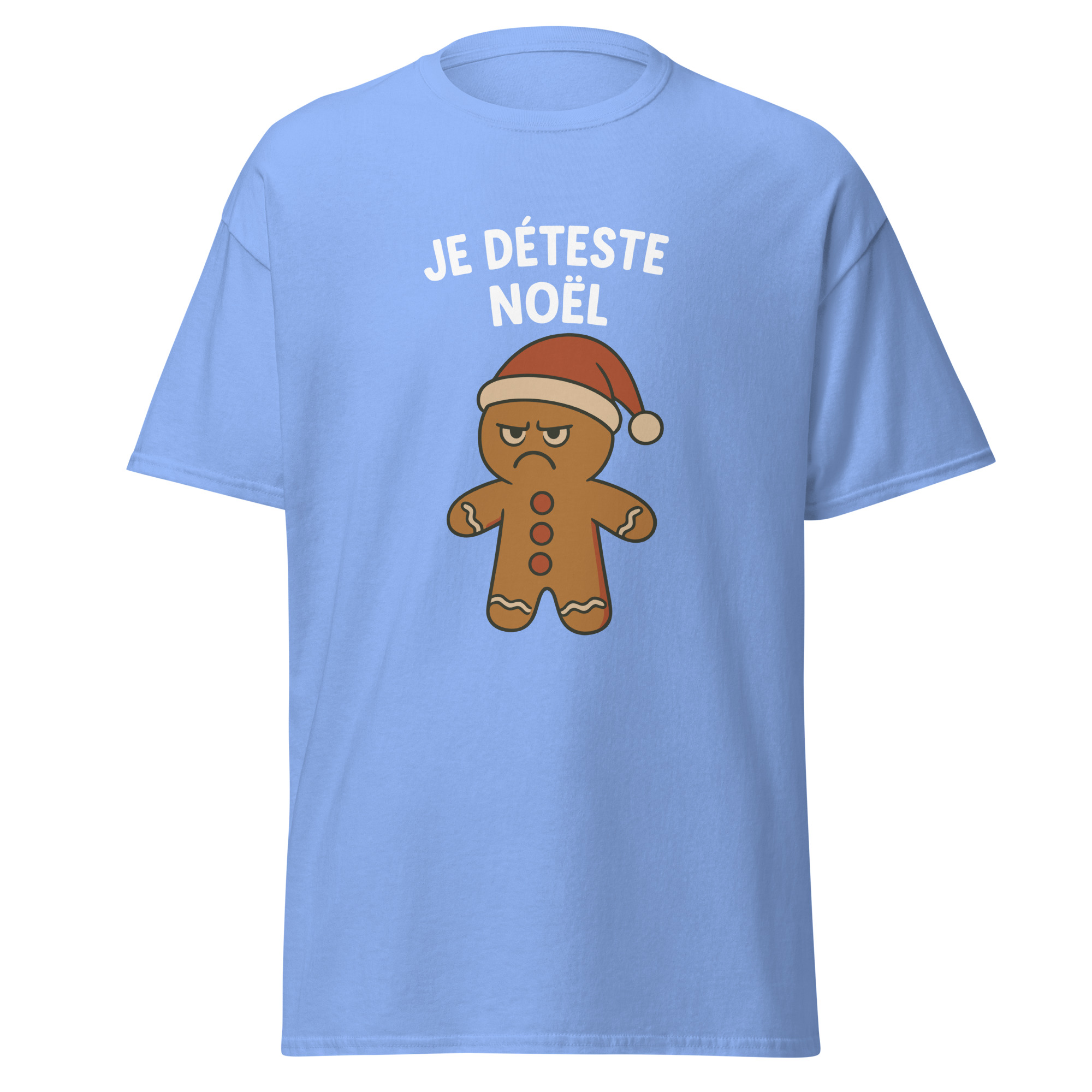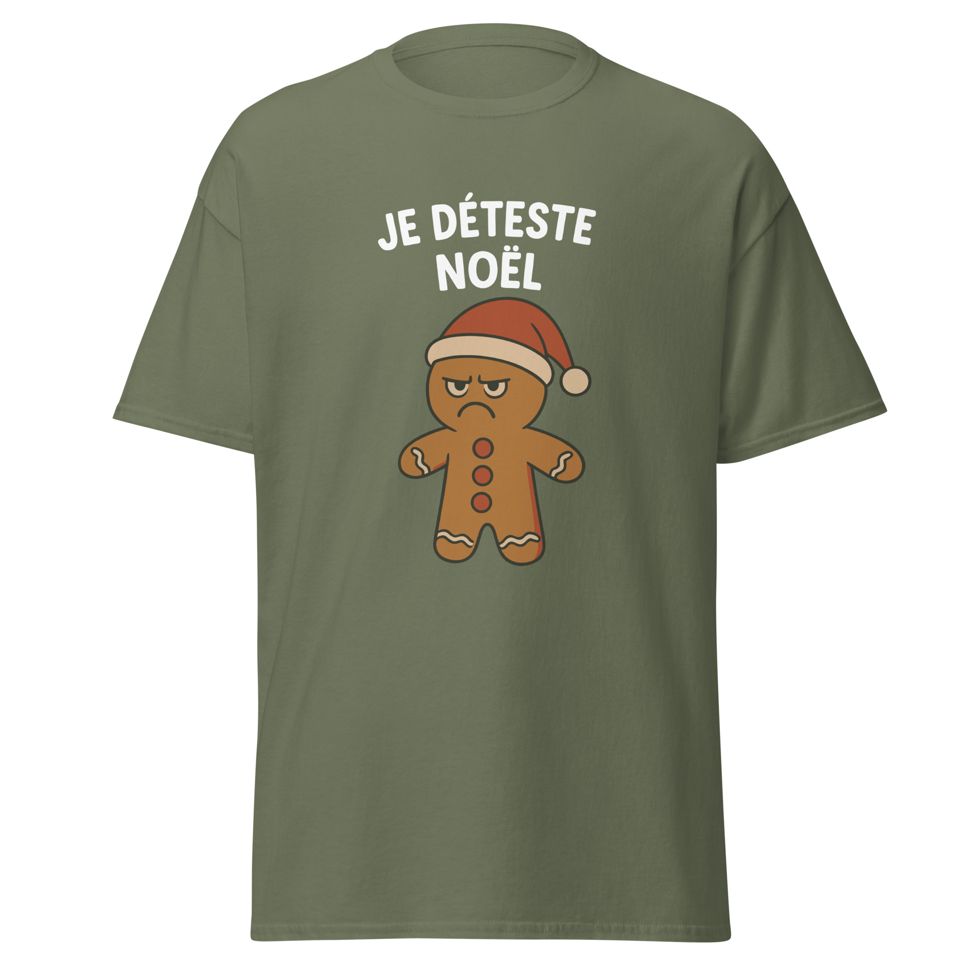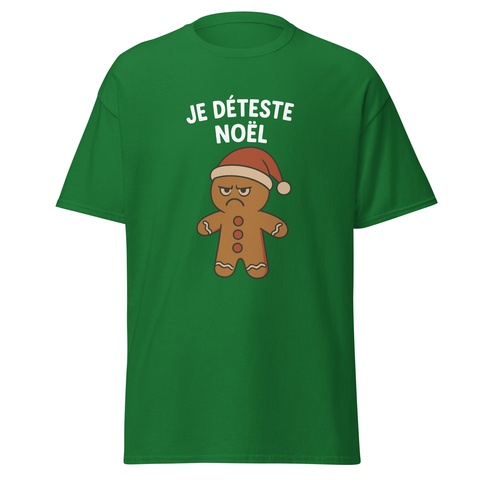 Ce t-shirt Je déteste Noël affiche un message clair et volontairement provocant. D’abord, le visuel met en scène un biscuit de Noël mécontent, coiffé d’un bonnet festif. Ensuite, le contraste avec l’imagerie habituellement joyeuse crée une ironie immédiate. Ainsi, le design détourne volontairement les codes classiques de Noël. Par conséquent, le message devient à la fois drôle et assumé.