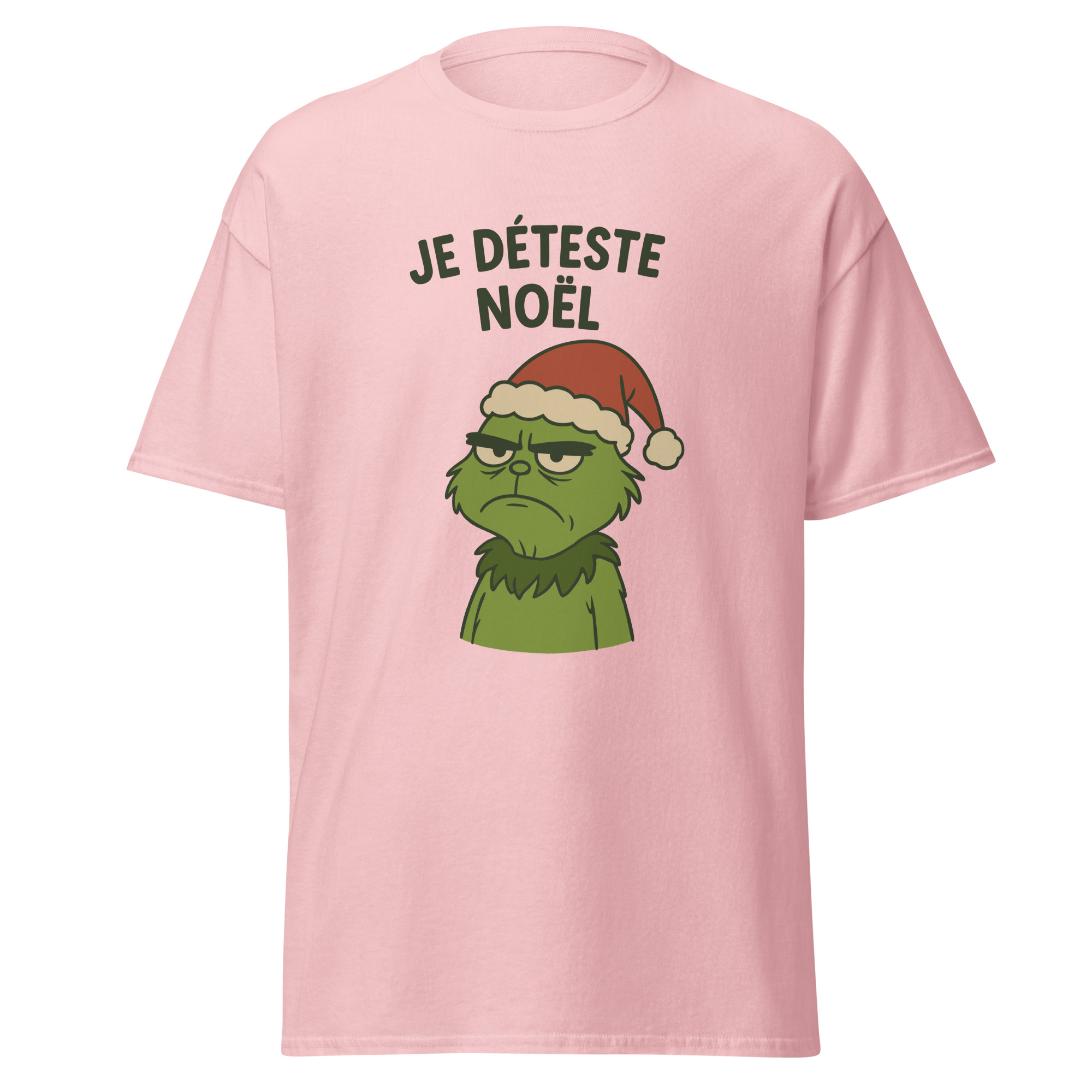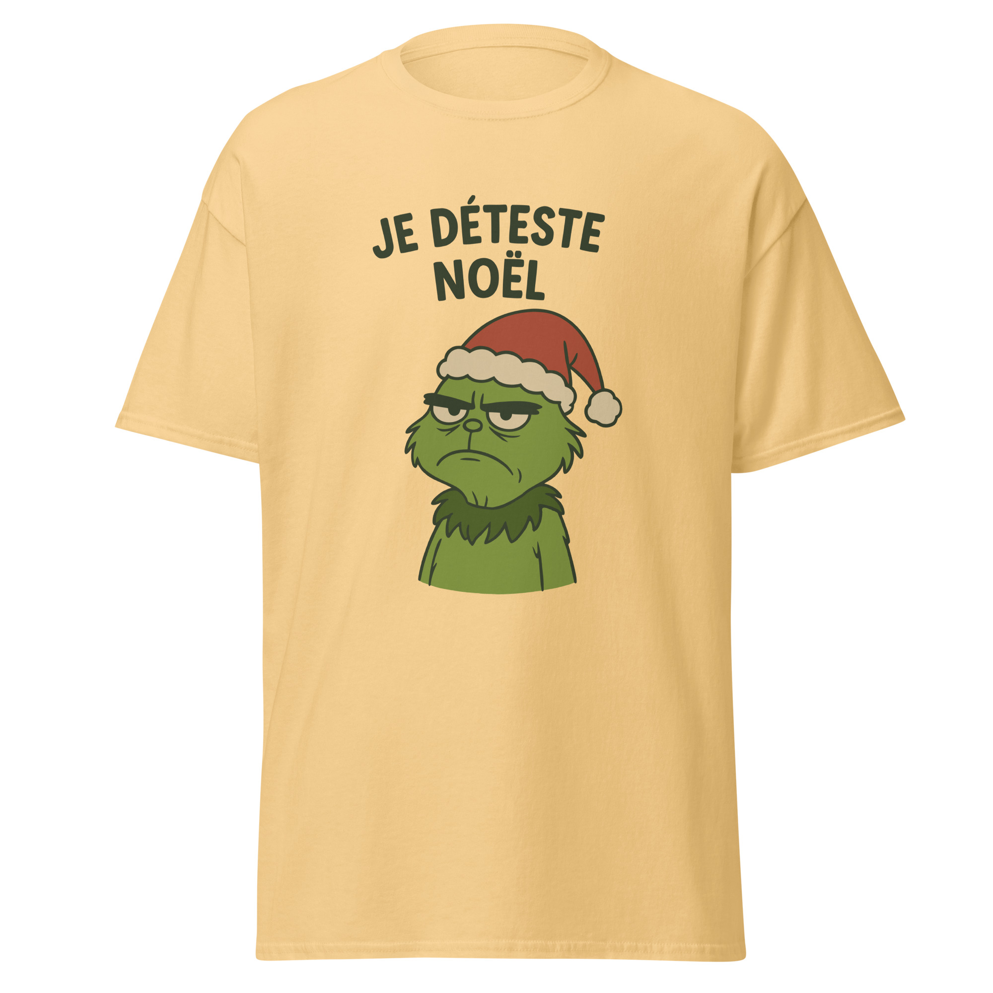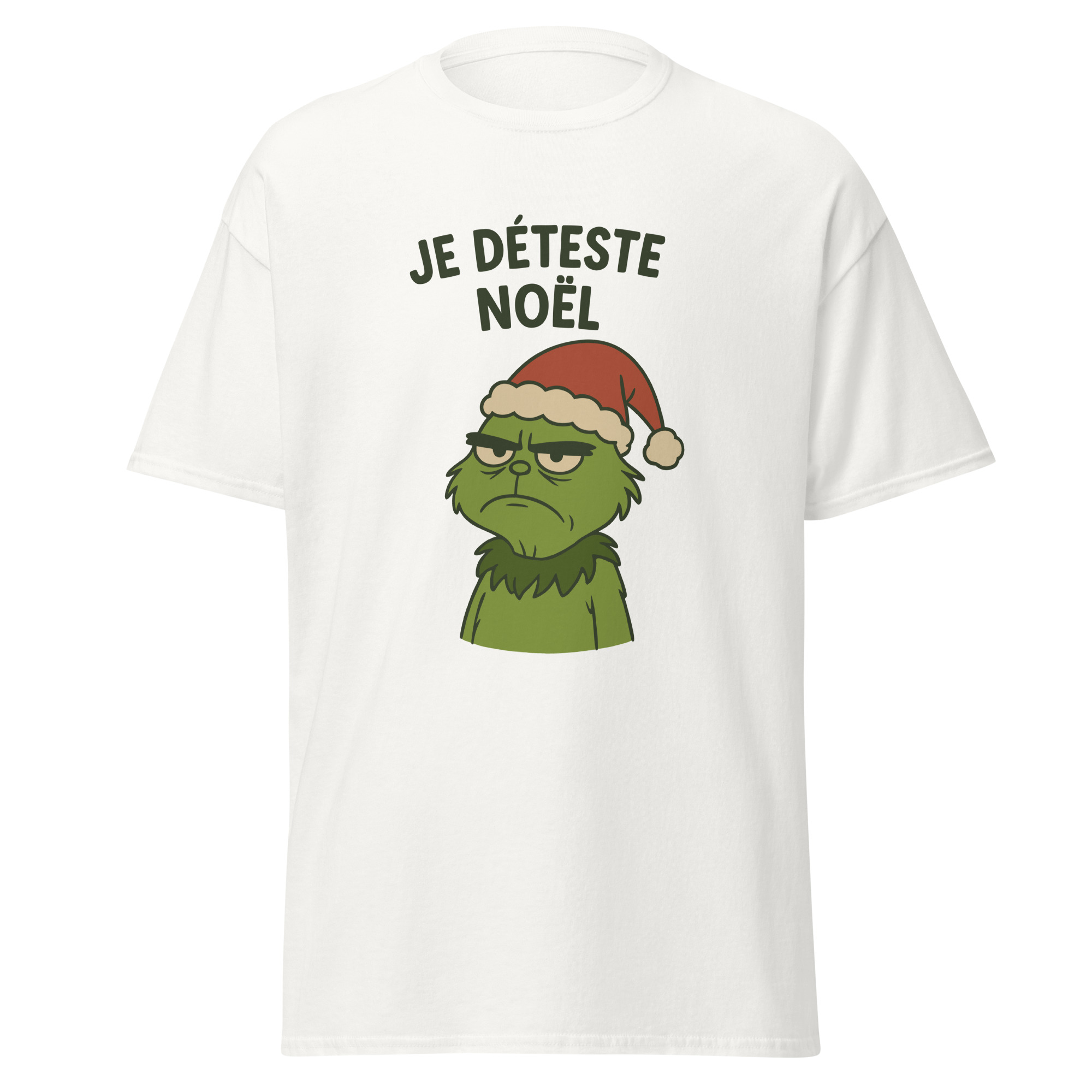 Ce t-shirt Je déteste Noël affiche un message direct et assumé. D’abord, le visuel met en scène un personnage grincheux coiffé d’un bonnet de Noël. Ensuite, son expression fermée contraste avec l’imagerie festive habituelle. Ainsi, le design crée une ironie immédiate et facilement compréhensible.