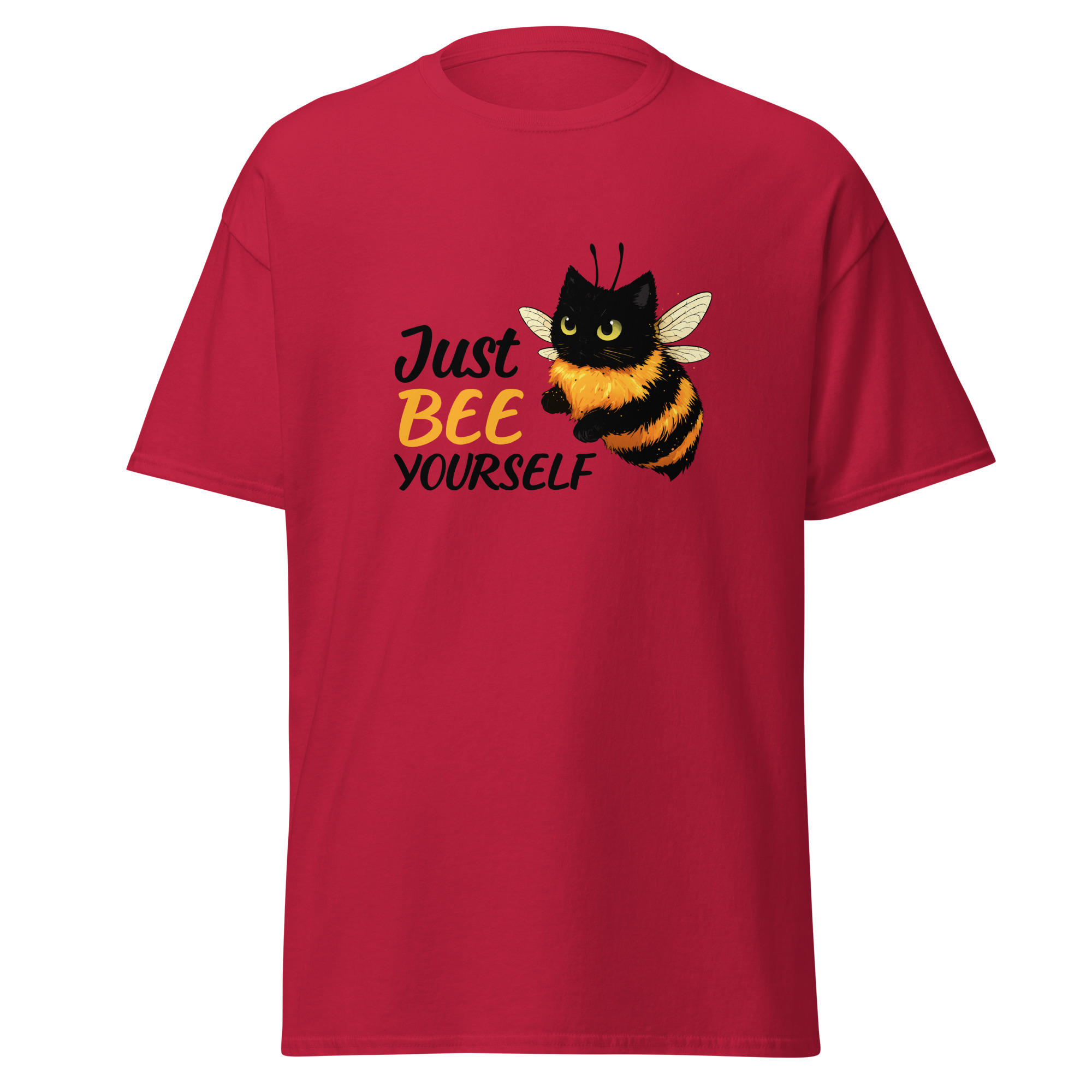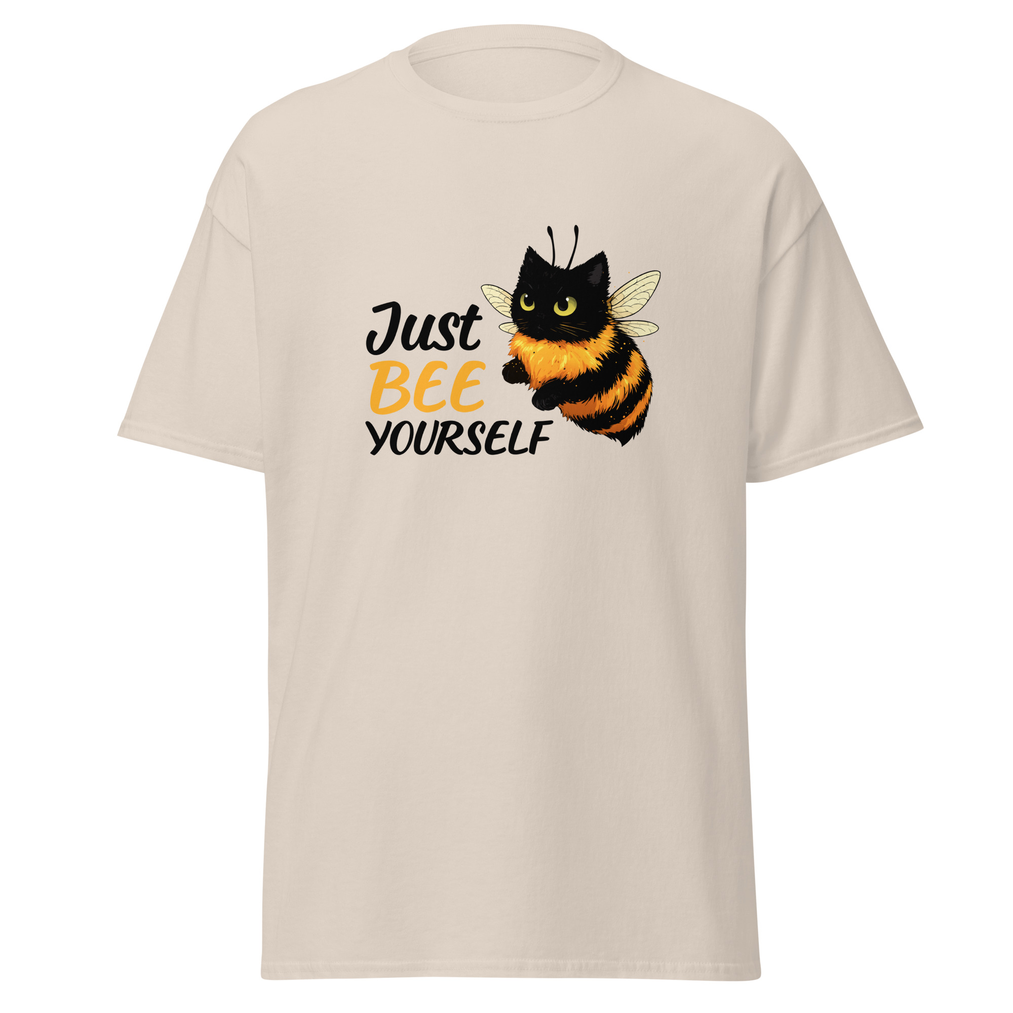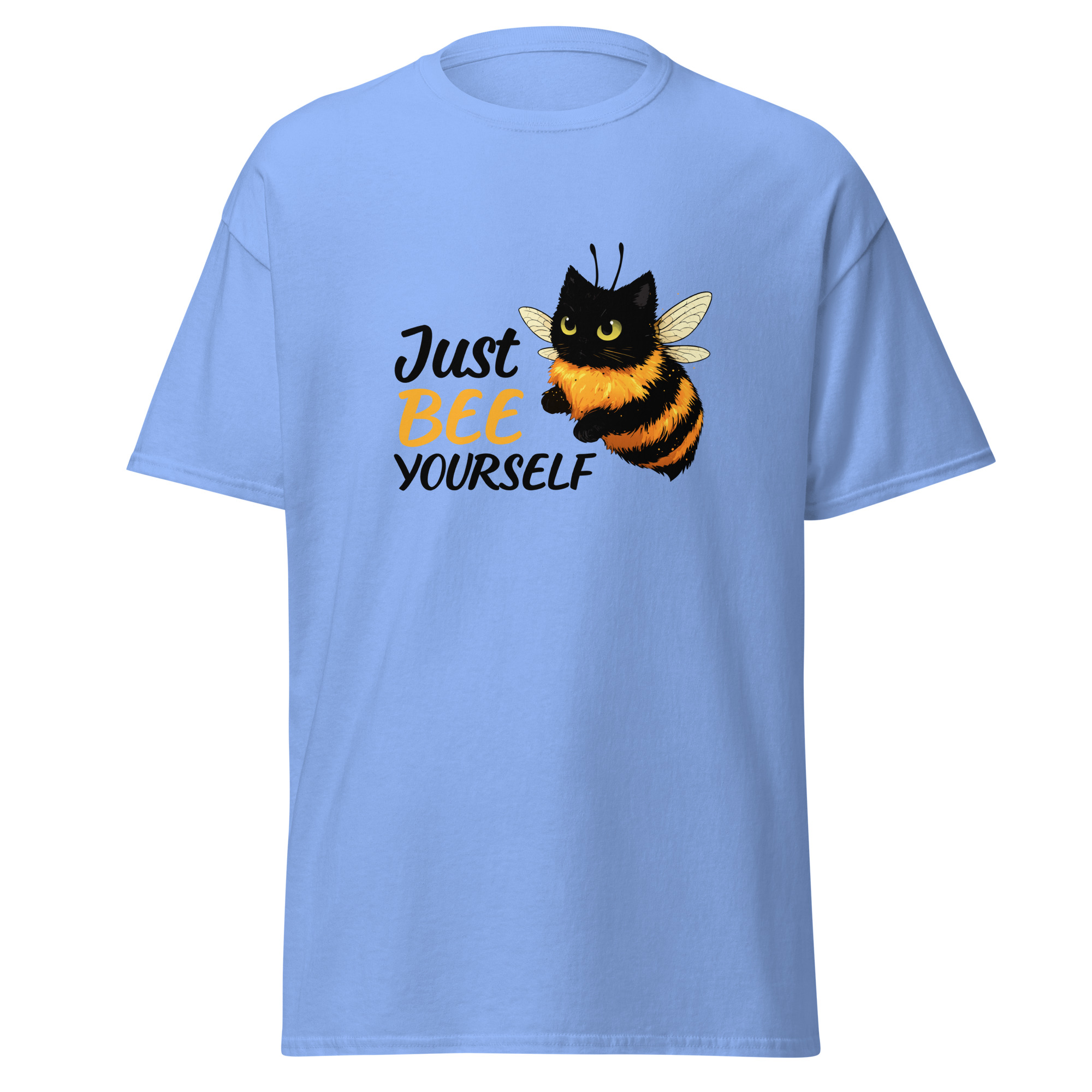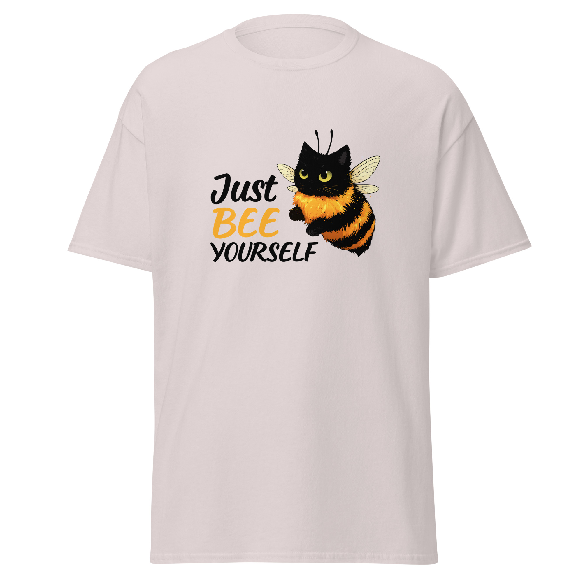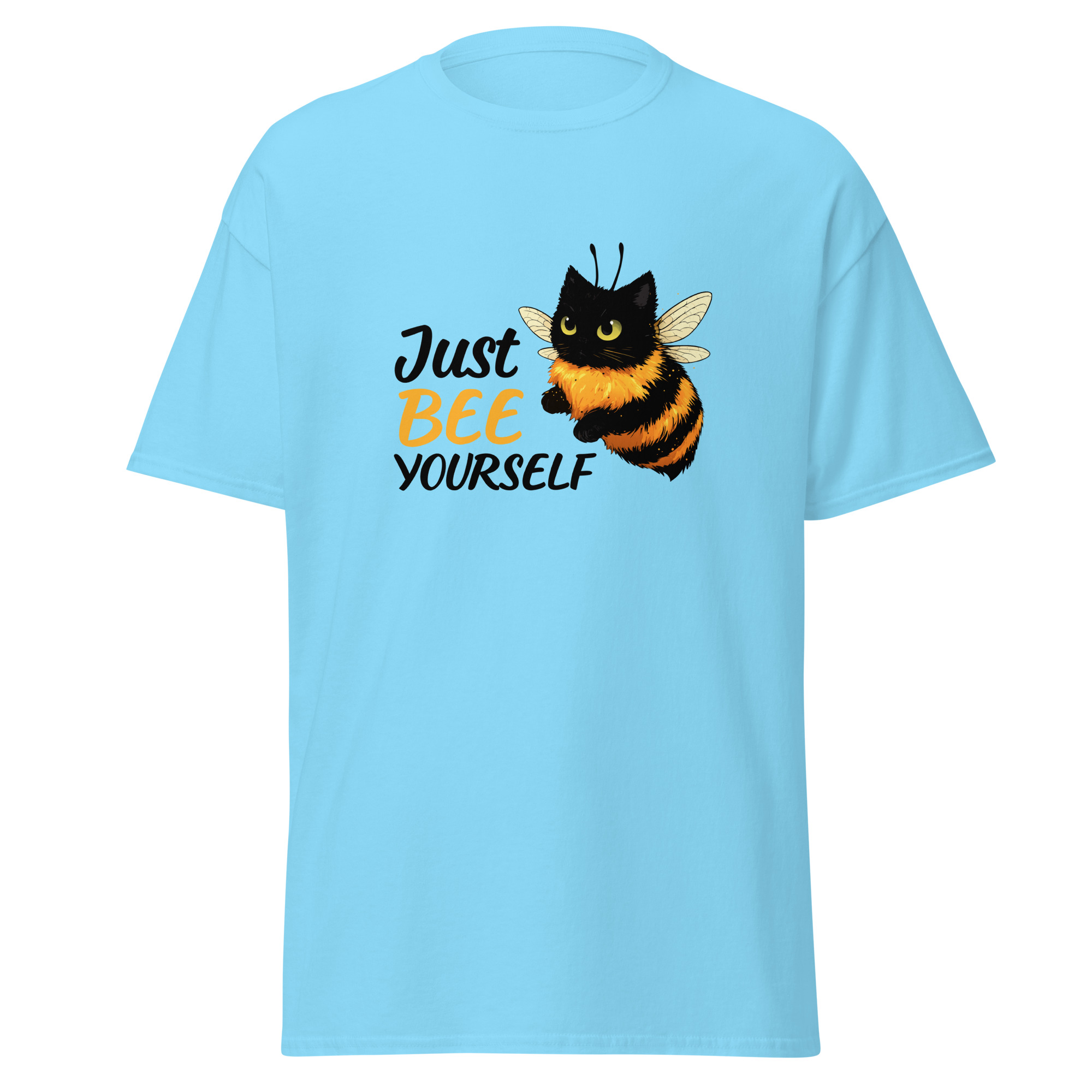 Ce t-shirt Just Bee Yourself joue sur un jeu de mots simple et un visuel attachant. L’illustration montre un chat transformé en abeille, ce qui attire immédiatement le regard. Le message combine humour et légèreté, avec une touche absurde assumée.