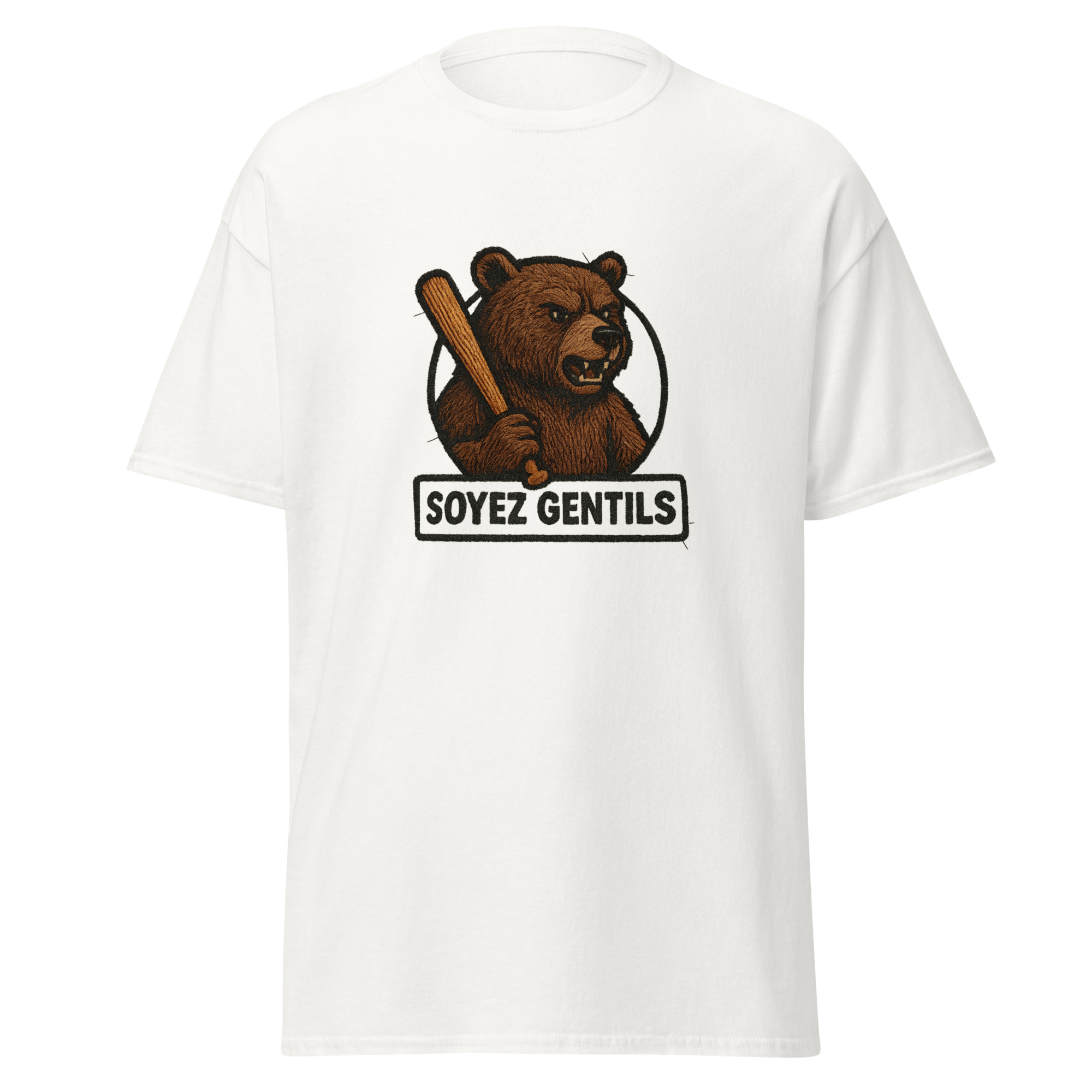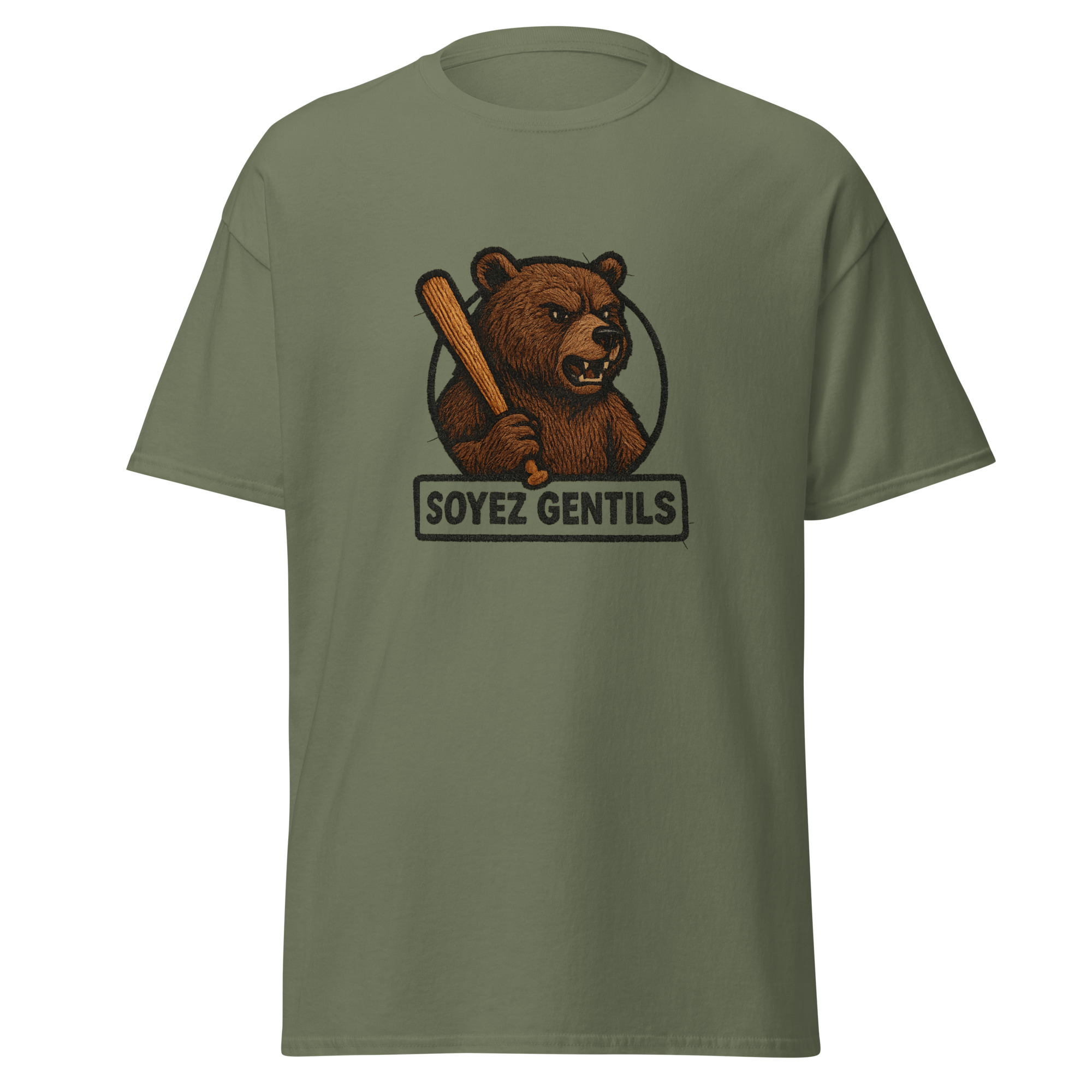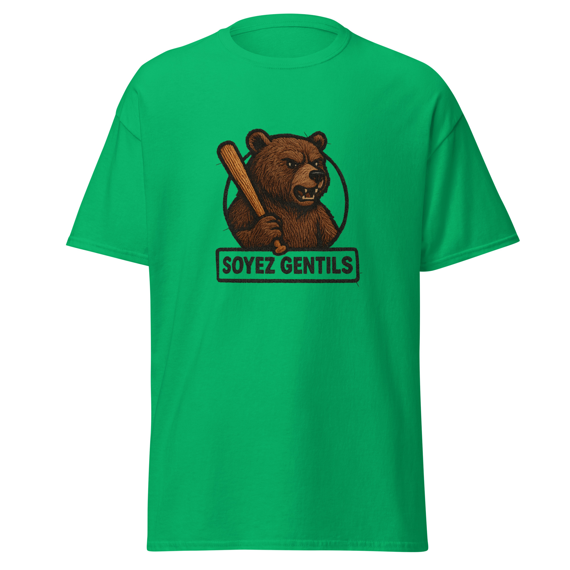 Ce t-shirt Ours Faché mise sur un humour visuel direct et sans détour. D’abord, l’illustration présente un ours en colère tenant une batte, traité dans un style écusson brodé. Ensuite, le message « Soyez gentils » crée un contraste immédiat avec l’attitude menaçante du personnage. Ainsi, le design joue habilement sur l’ironie.