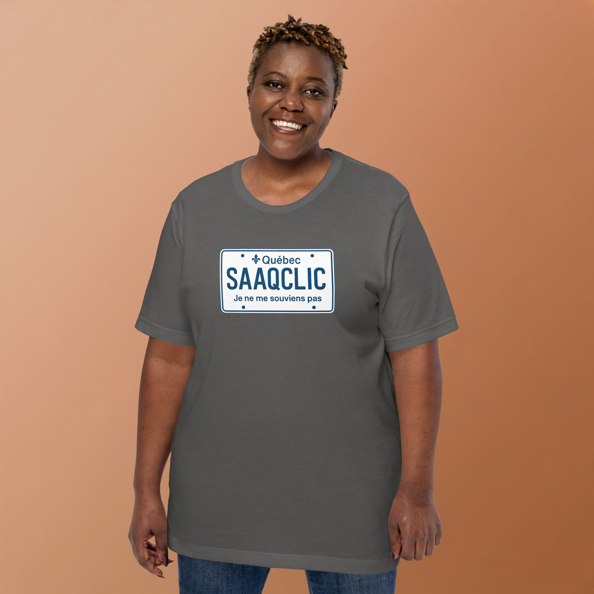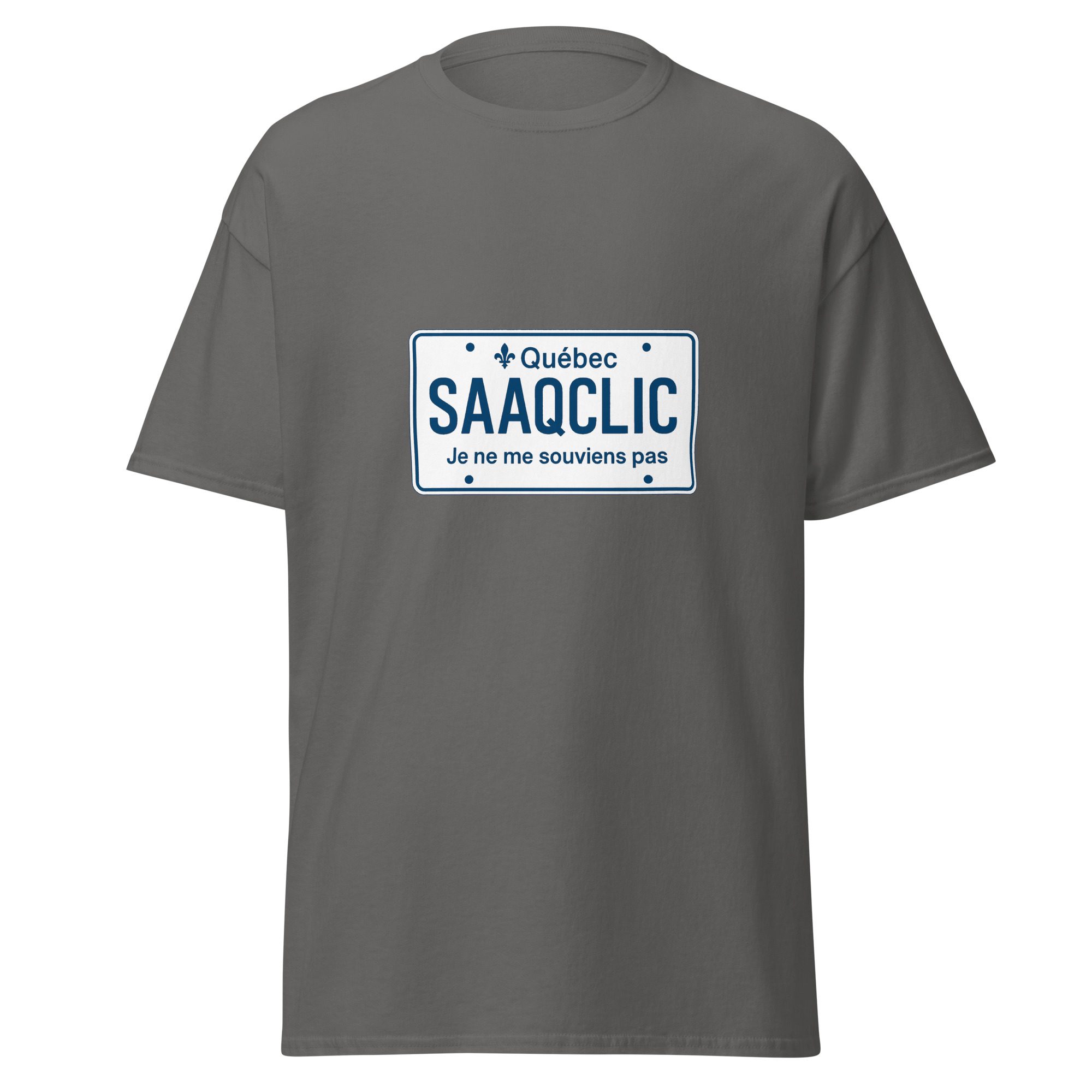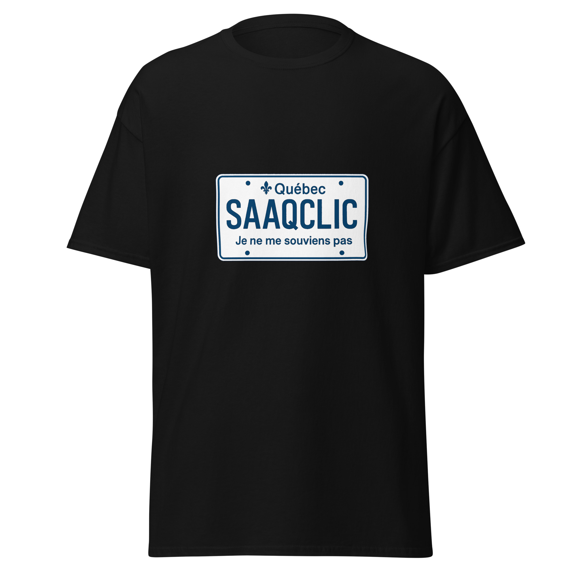 Ce t-shirt SAAQClic affiche un message inspiré d’une frustration bien connue au Québec. D’abord, le visuel reprend le style d’une plaque d’immatriculation. Ensuite, le texte SAAQClic Je ne me souviens pas évoque immédiatement les difficultés liées aux connexions et aux accès en ligne. Ainsi, le message devient clair, simple et efficace.